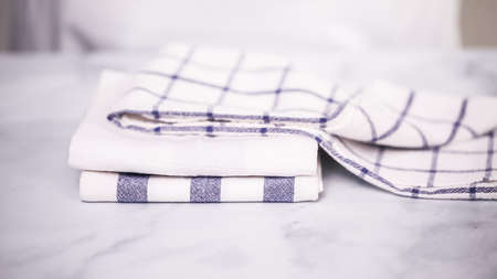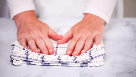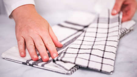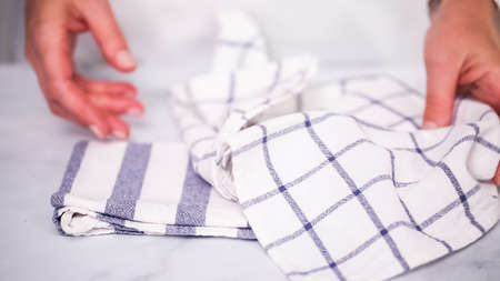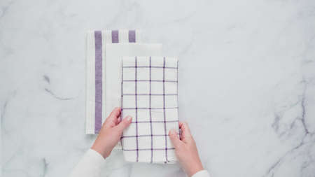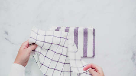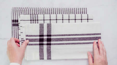 Hand on kitchen dishtowels ordered on grey marble table with copy space.