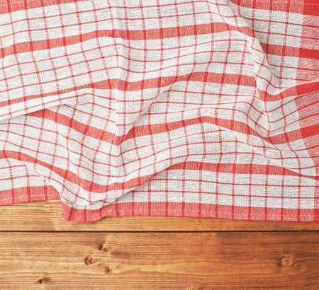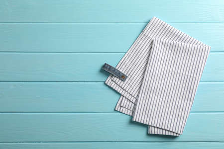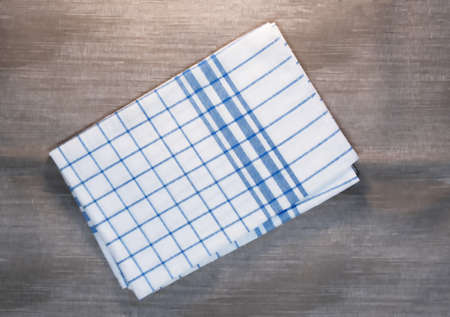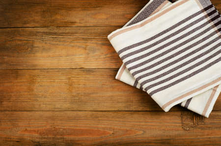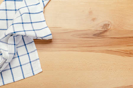Kitchen towel or napkin over the rustic wooden table. View from above with copy space