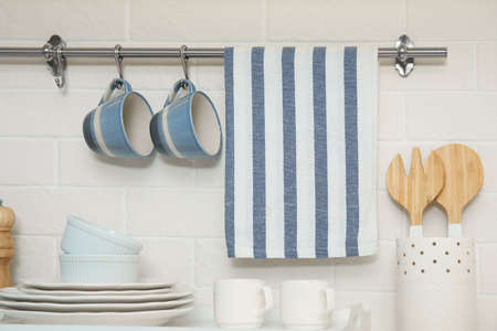 Clean towel and utensil hanging on rack in kitchen, closeup