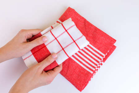 Woman holding new red checkered kitchen towels. Cooking, cleaning, laundry concept.
