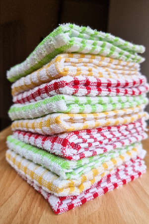 A stack of colorful kitchen towels on a wooden table. Selective focus.