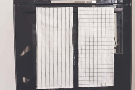 A close-up captures a white, textured kitchen towel draped over a shiny oven handle. The scene presents warm tones, possibly from indoor lighting, and hints at a domestic setting. Its simple composition could serve various culinary or lifestyle themes for commercial projects or editorial use.