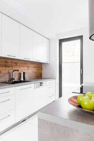 Cropped view of modern kitchen in white tones with white surface, black sink and decor. Cozy place for cooking. luxury cuisine interior design