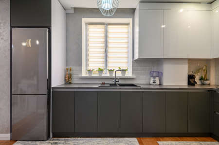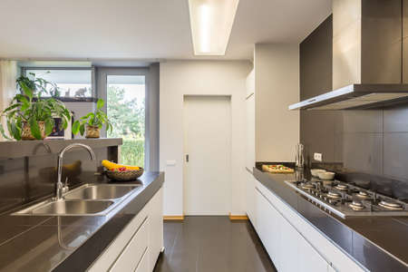 Kitchen interior with the aisle between two worktops, silver sink and amenities