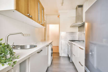 Fragment of interior of light narrow home kitchen with minimalist style white furniture with sink and stove