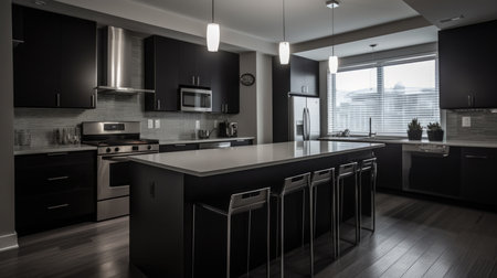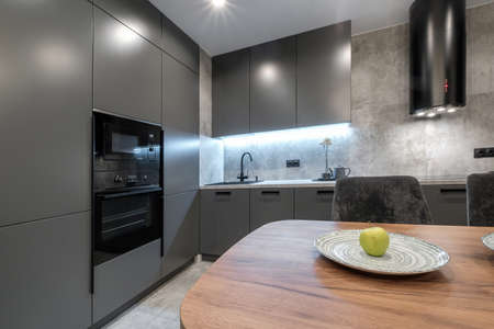 Interior of contemporary kitchen with stylish black cupboards and appliances near dining area in contemporary apartment
