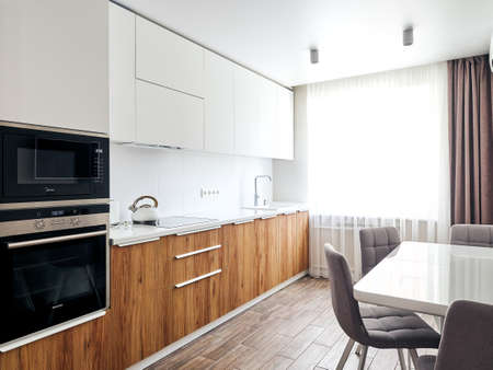 Spacious kitchen interior design with white furniture and new furniture. kitchenware and appliances. Bright and large dining room. cooking time