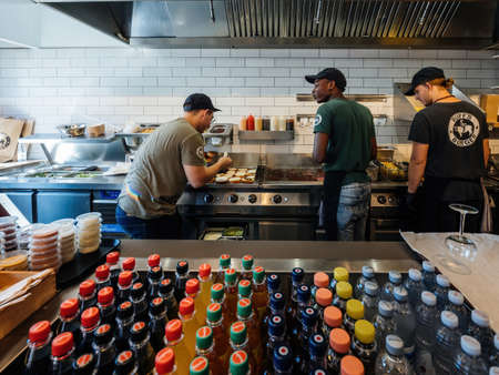 Rear view of multi ethnic workers inside cafeteria burger restaurant with bottles of multiple cold drink in front