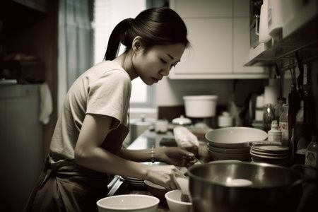 Beautiful young Asian woman cooking in the kitchen, black and white tone. Generative AI