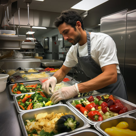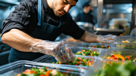Professional male chef in a white coat and blue apron meticulously arranging fresh, colorful ingredients in clear containers on a stainless steel counter in a commercial kitchen.