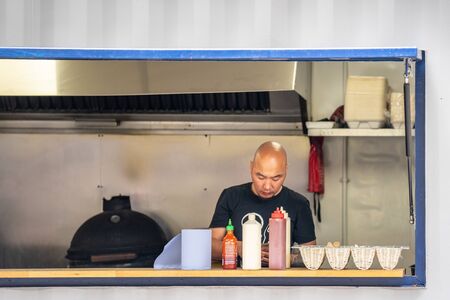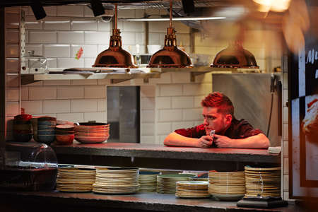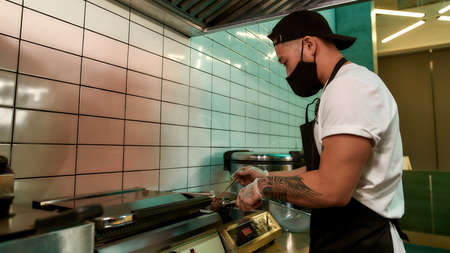 Behind the scenes of brands. The chef cooking in a professional kitchen of a restaurant meal for client or delivery. Open business from the inside. Meals during the quarantine. Hurrying up, motion.
