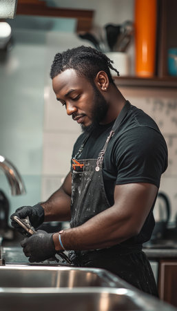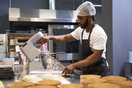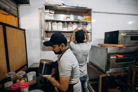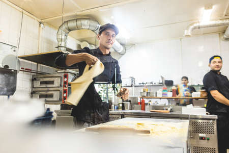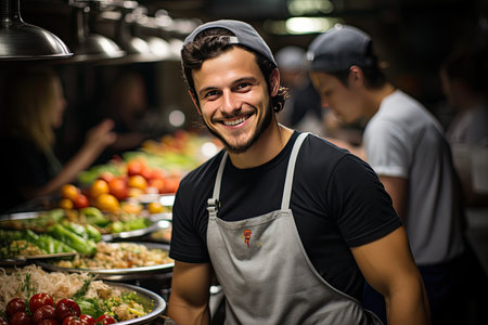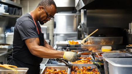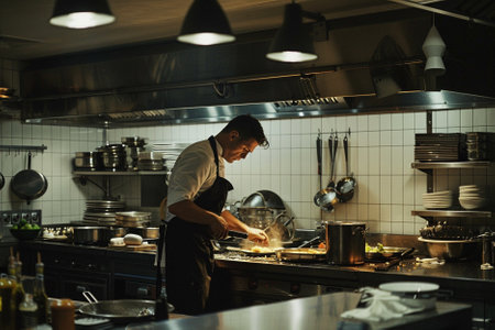 Man is seen preparing food in busy restaurant kitchen. Behind-the-scenes work that goes into creating delicious meals in professional setting.