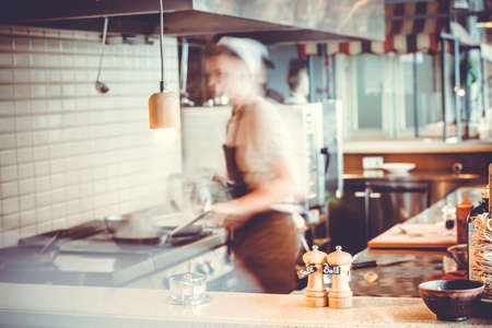 Blurred restaurant kitchen,Chef cooking food and preparing in japan shop,motion work
