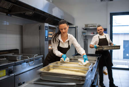 Woman washing dishes in industrial kitchen with blurred background and copy space for text placement