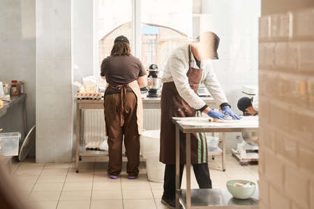 Young three chefs startup partners, small business blogger live streaming via mobile application technology, bakery sales online promotion, fresh bread, pastry food, and commercial kitchen cooking.