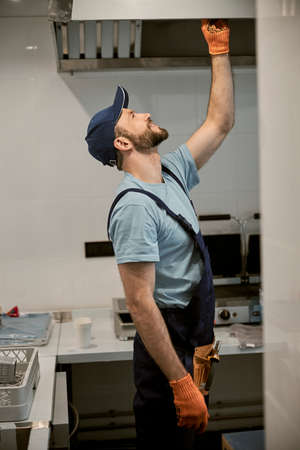 Food concept. Young handsome chef in white uniform kindles coals and monitors temperature degree for roasting meat in interior of restaurant kitchen. Preparing traditional beef steak on barbecue oven.