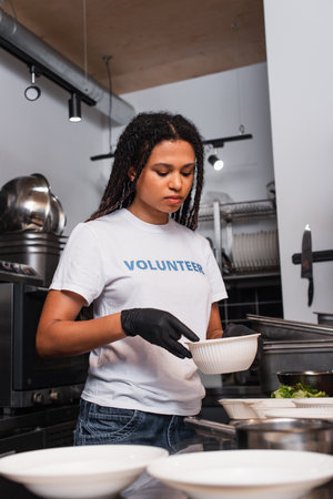 african american woman in t-shirt with volunteer lettering holding plastic bowl with soup in kitchen