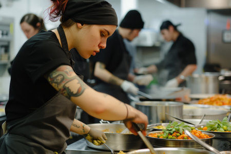 Staff members in uniform collaborating in a busy kitchen chopping vegetables and stirring pots as they work efficiently to prepare meals during peak service hours