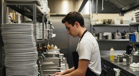 A young man wearing a white shirt and black apron is focused on his work in a modern kitchen. He is standing next to a tall stack of plates on a stainless steel counter. The kitchen is well-organized with various utensils, pots, and pans neatly arranged on metal shelves. Condiments and other kitchenware are visible on the counter, indicating a and clean cooking environment. The man appears to be preparing something, showing a concentrated and dedicated mood.