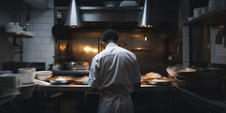 Back of Professional chef cooking in a busy restaurant kitchen, generative aI.