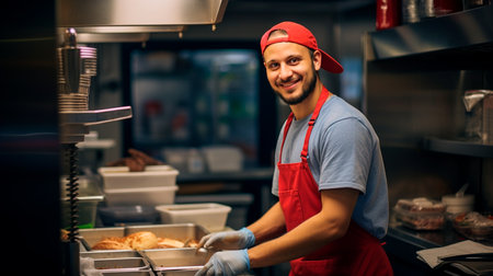 A man in a black apron is cooking food in a kitchen. He is wearing a yellow glove and a red apron