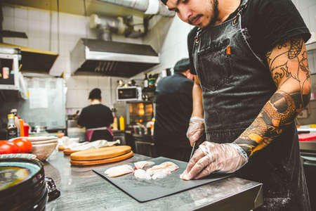 Male bald chef with beautiful tattoos on his hands cutting a meat while standing in a restaurant kitchen