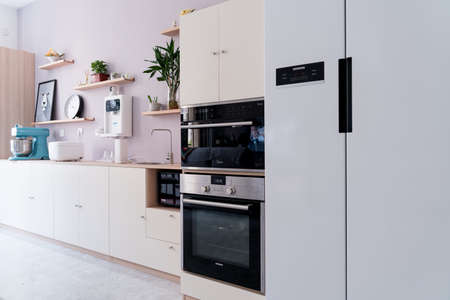 Side view of contemporary black oven, sink and kitchenware. White wood furniture with appliances and decor. bakery concept. Cozy place for cooking