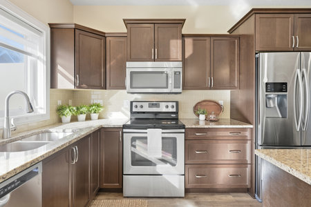 Luxury kitchen with stainless steel appliances in new house. Nobody inside