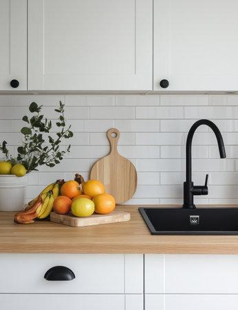 Close-up of a white kitchen with a light wood countertop, tiled backsplash, fruit on the counter, and a black sink and faucet. --ar 23:30 --v 6.1 Job ID: c855b265-ed02-481b-8b3e-0c7f95225d43