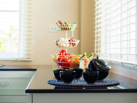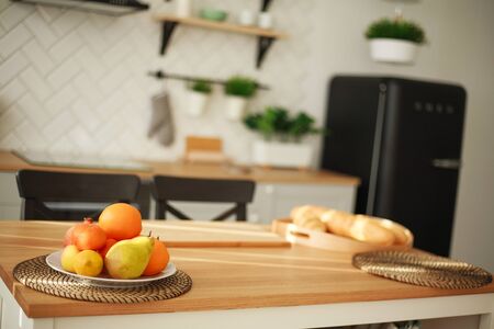 Bread and other bakery in basket are put on table in modern kitchen with concept of clean and diversity and different style of accessories for cooking at home.