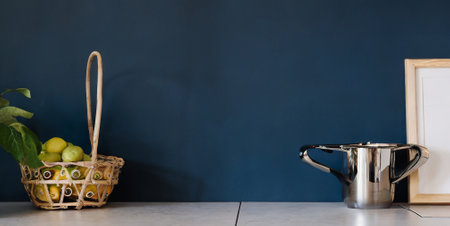 Kitchen table with wicker basket of fresh green apples and milk jug on blue wall background