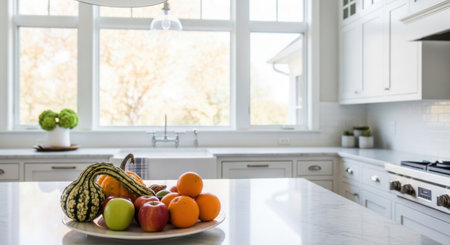 A well-lit kitchen with white cabinets and countertops. A bowl of fresh fruits, including apples, oranges, and pears, sits on the counter. The kitchen features a large window with a view of trees outside, allowing natural light to fill the space. A modern stove and sink are also visible.