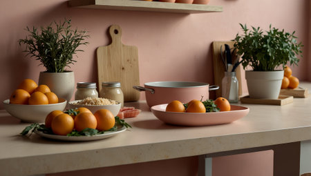 A Modern Minimalist Kitchen featuring Vibrant Citrus Fruits and a Sleek Electric Kettle