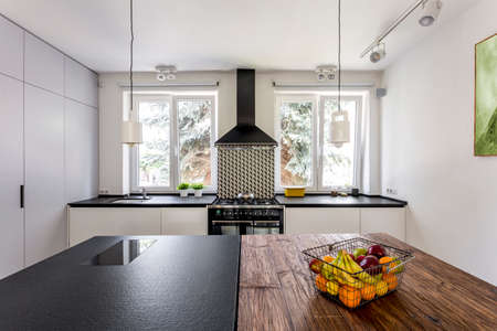 Shot of a spacious kitchen area with elegant black oven and a hood