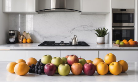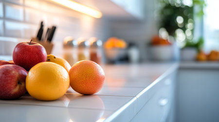Fresh Fruits on a Modern White Kitchen Counter with Cooking Utensils and a Blurred Background