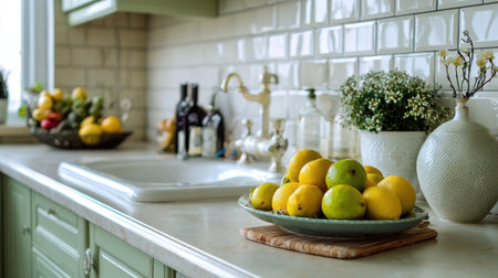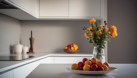 A serene kitchen interior featuring a marble countertop adorned with a bowl of fresh fruits, elegant flowers in vases, and charming decor, inviting warmth and beauty.
