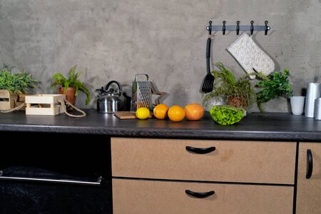 Black sink into Nordic kitchen interior design. Health food products. Salad ingredients on background. Home decoration and utensils. preparation for cooking
