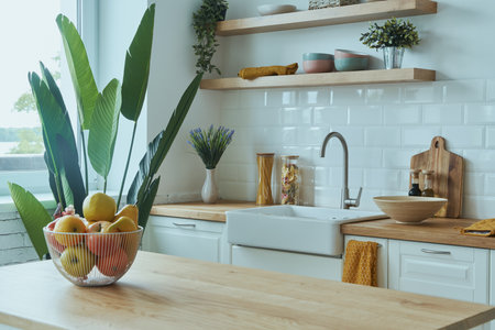 Cozy modern interior of kitchen interior with white furniture and bright elements