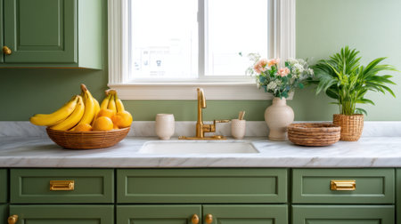 A vintage green kitchen counter adorned with fresh fruits and elegant decor creates a bright and inviting aesthetic. Perfect for a warm and stylish home.