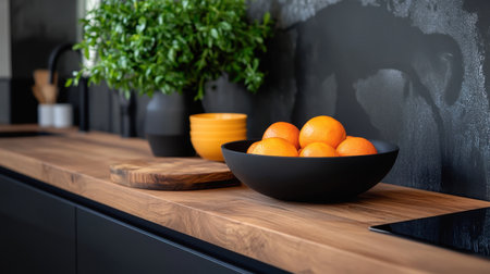 A beautiful arrangement of fresh oranges in a black bowl on a wooden kitchen counter, accentuated by a green plant, creating a modern and inviting kitchen atmosphere.