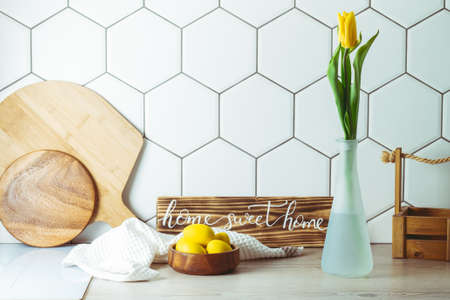 Interior shot. Home sweet home handwritten sign on kitchen countertop next to wooden bowl with Easter eggs and yellow tulip in vase and cutting boards on hexagonal white tile background