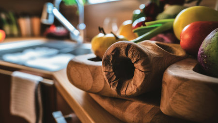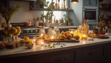 a kitchen, with a countertop filled with fresh fruits and vegetables, ready for cooking, created with generative ai