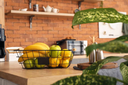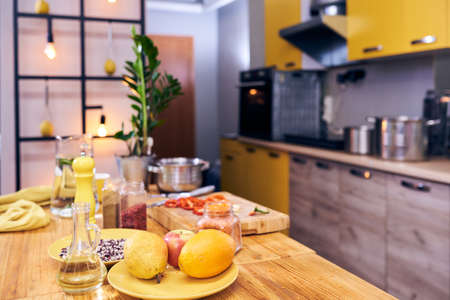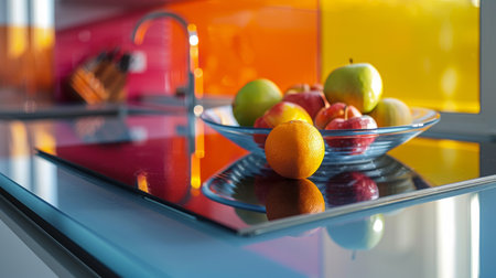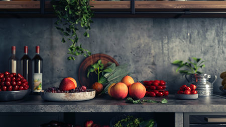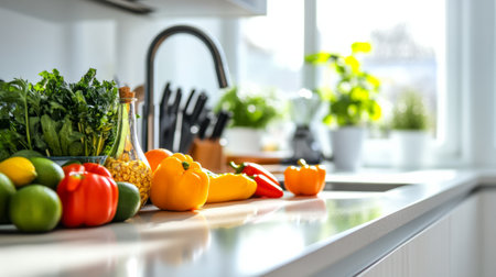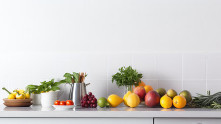 Modern and bright fruit kitchen counter with colors and vegetables, soft and natural lighting. generative ai