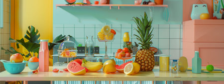A bright and colorful kitchen interior with fresh fruits, including pineapples and watermelons, arranged on the counter. The vibrant setting is ideal for promoting healthy eating and modern kitchen designs.