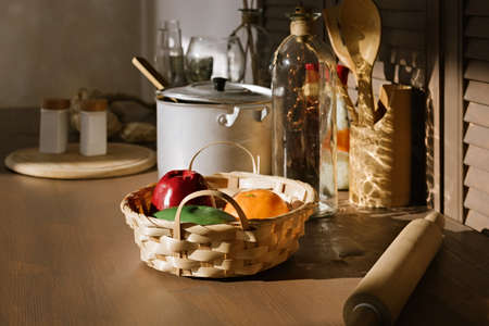 Apples in a wicker basket in the kitchen with hard shade from the sun. Background image