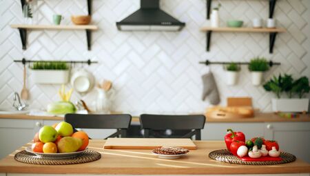 Spacious kitchen interior design with white furniture and new furniture. kitchenware and appliances. Bright and large dining room. cooking time