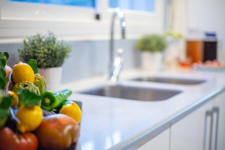 Fresh vegetables on white marble countertop in modern kitchen, closeup