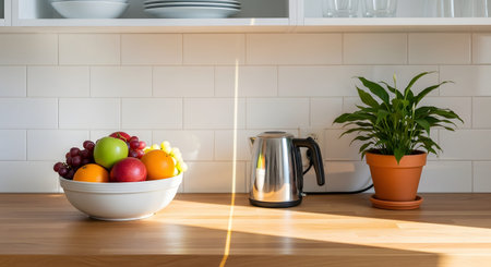 A sunlit kitchen counter features a white bowl filled with fresh apples, oranges, and grapes alongside a stainless steel electric kettle. A potted peace lily plant adds a touch of greenery to the clean, modern white-tiled space.