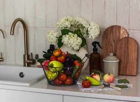 Kitchen still life - fresh vegetables and fruits in a basket, a bouquet of hydrangeas in a vase, kitchen utensils on the table near the sink