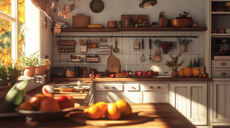 A cozy autumn kitchen bathed in natural light, featuring fresh fruits and vegetables on a wooden table, surrounded by rustic decor and warm colors, perfect for seasonal cooking inspiration.